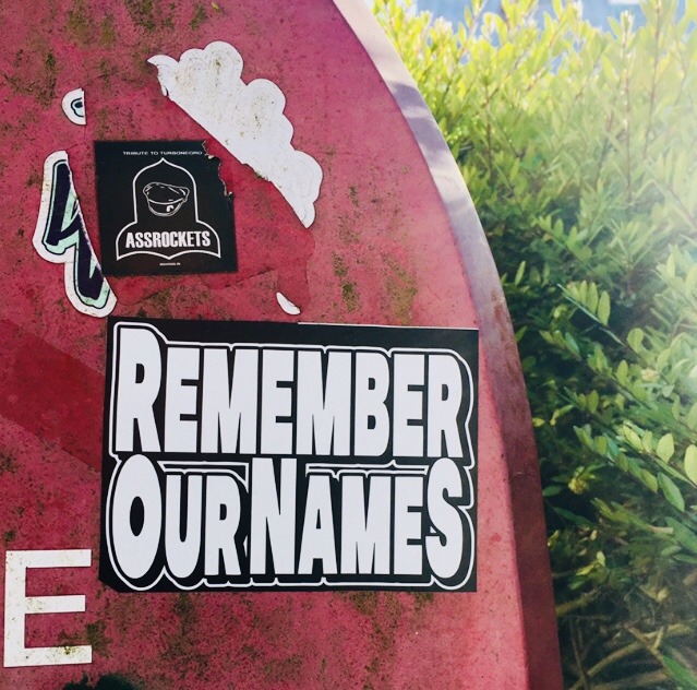 Navnene til de to som har skrevet dem står på messingskilt under hverandre på muren.