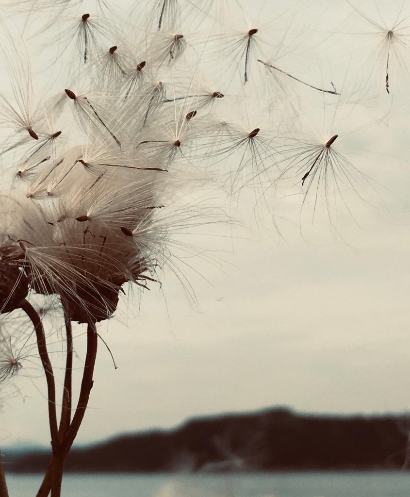 I går: Frø fra lilla tistel føyk i den varme vinden. Myke som skyer, snø, sang.