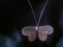 Anheng laget av brilleglass med lasergravert tekst.